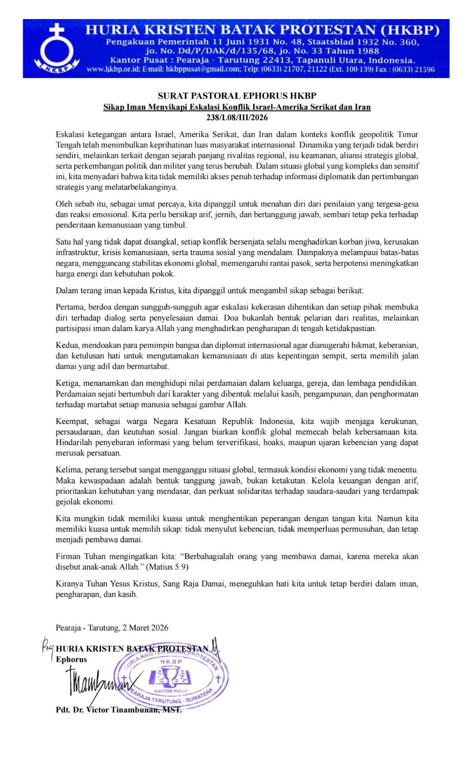 Ephorus HKBP: Di Tengah Perang Israel-Iran, Jadilah Pembawa Damai!